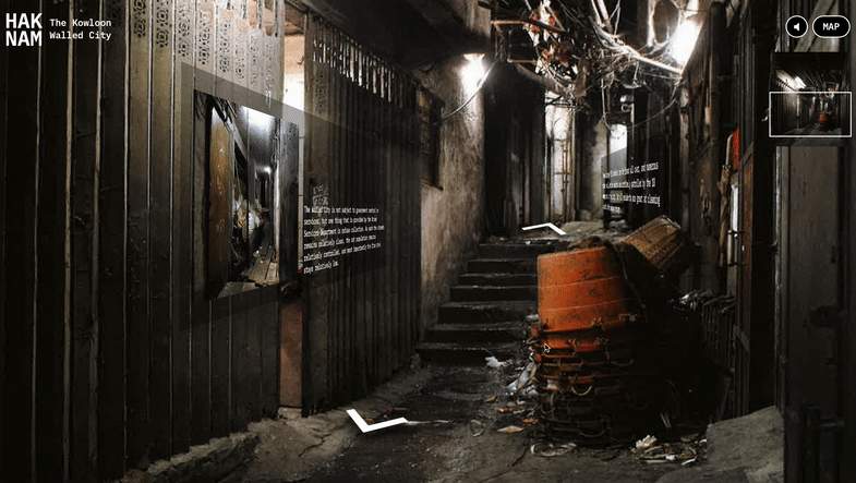Interactive guide focused on exploring and navigating the lost Kowloon Walled City in 1970s Hong Kong.